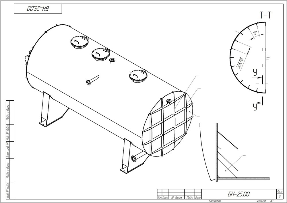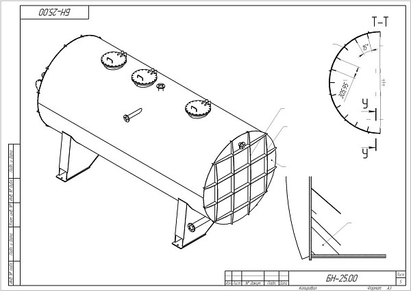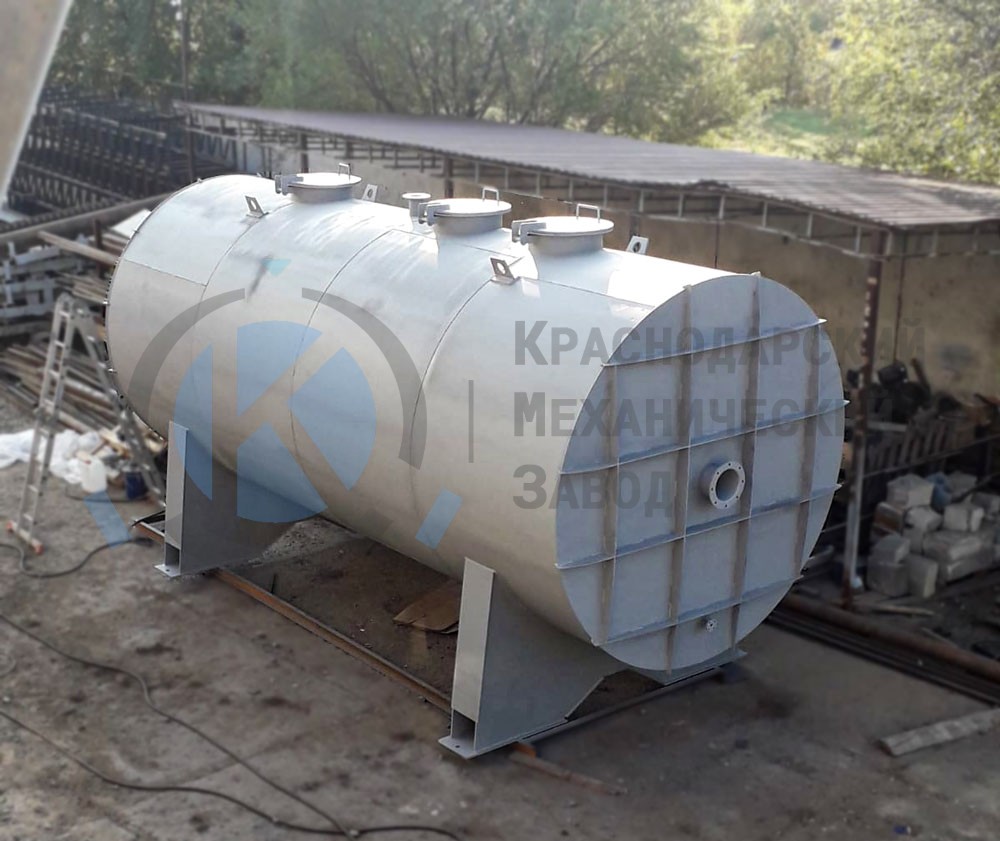 Горизонтальный резервуар представляет собой цилиндрическую емкость с опорными седловыми ложементами. Такое решение обеспечивает равномерное распределение нагрузки и устойчивость при заполнении.